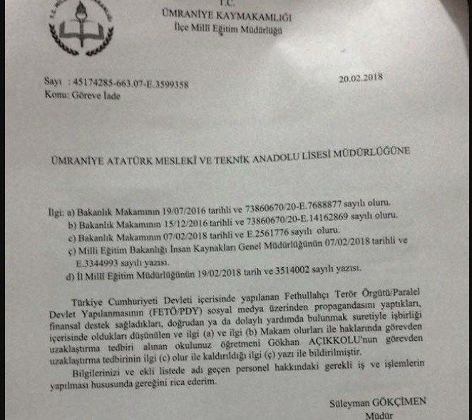 The reinstatement decision, numbered E.2561776, was made by the Education Ministry on Feb. 7, 2018. The official document for Açıkkollu’s reinstatement was delivered by the principal of his former school to Açıkkollu’s wife, who had also been dismissed from her job as a teacher by a government decree issued under the state of emergency declared in the aftermath of the failed coup.